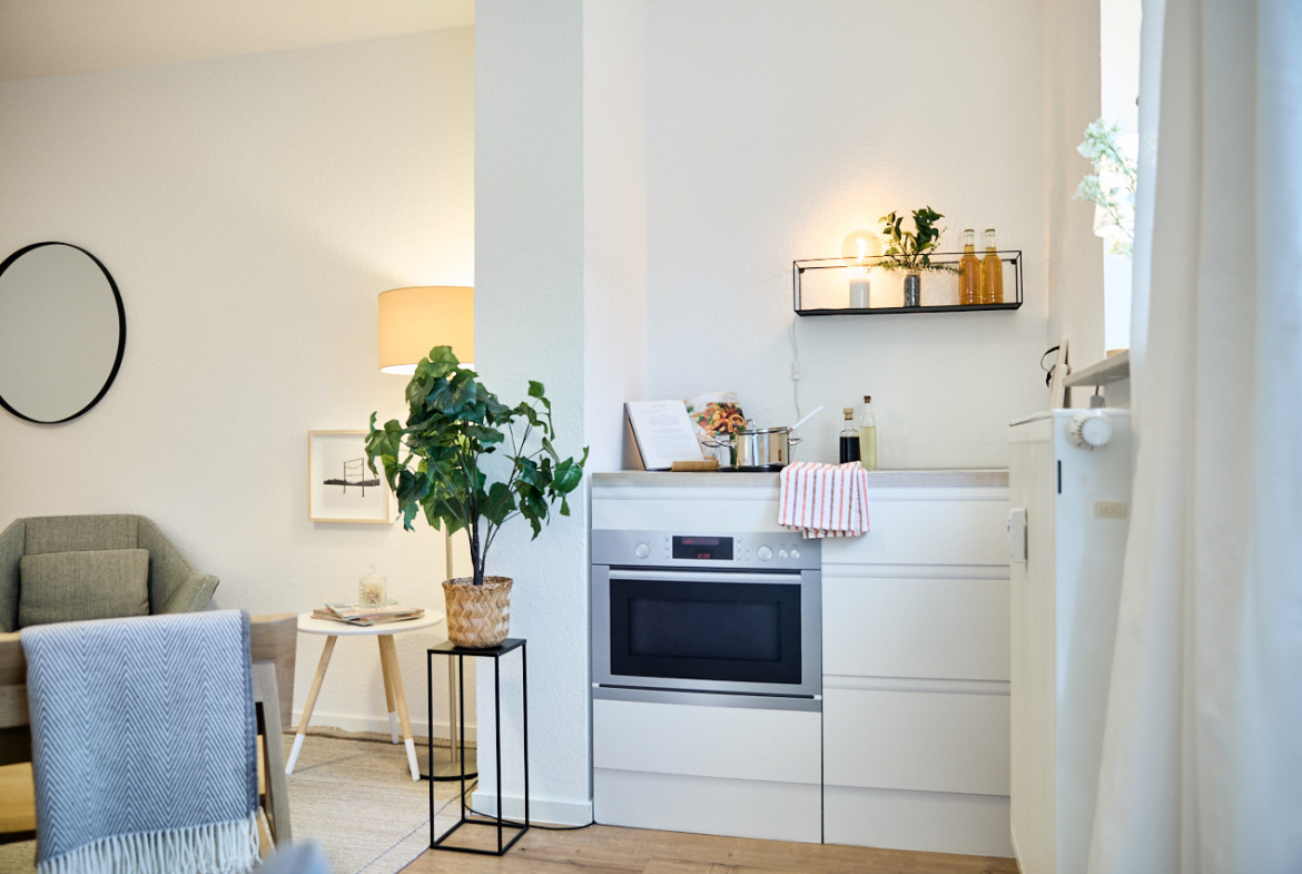 Das Appartement präsentiert sich nach einer umfassenden Modernisierung in 12/2025 in einem zeitgemäßen und gepflegten Zustand. Ein neuer Laminatboden sorgt für ein modernes Wohnambiente. Die Wände sind sorgfältig gespachtelt, tapeziert und frisch gestrichen. Doppelverglaste Kunststofffenster mit neuer Fensterbank aus Marmor sorgen für eine gute Wärme- und Schalldämmung.