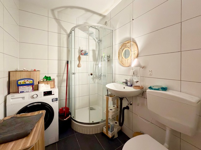 Das Badezimmer wurde vor rund einem Jahr umfassend modernisiert. Im Zuge der Sanierung erfolgte ein kompletter Austausch der Sanitäranlagen. Anstelle der Badewanne wurde eine komfortable Dusche eingebaut, zusätzlich mit einem praktischen Waschmaschinenanschluss.