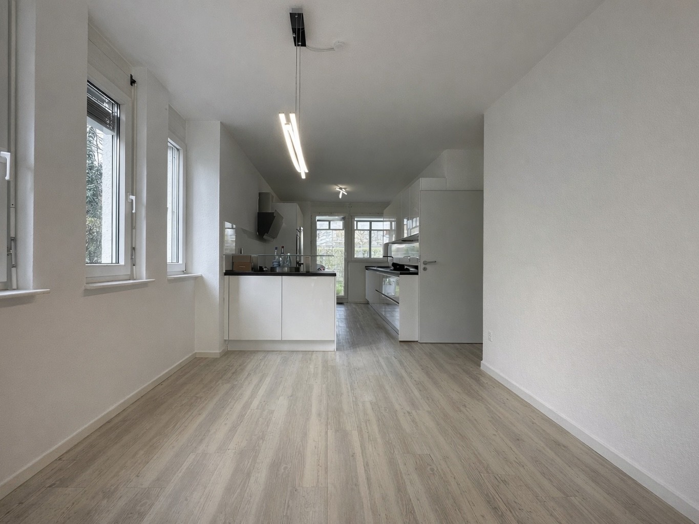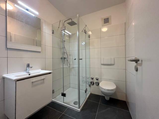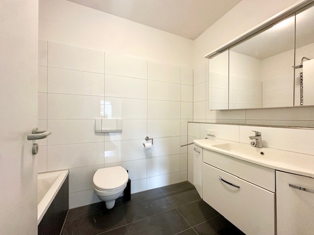 Sowohl das innenliegende Wannenbad als auch das Duschbad sind türhoch gefliest und mit Festverglasungen ausgestattet, die natürliches Licht hereinlassen, ohne die Intimsphäre zu beeinträchtigen. Sowohl die Bäder als auch Terrasse und Balkon sind mit hochwertigen Fliesen ausgestattet. In den übrigen Wohnräumen wurde modernes, pflegeleichtes Vinyl verlegt, das für eine warme und einladende Atmosphäre sorgt.